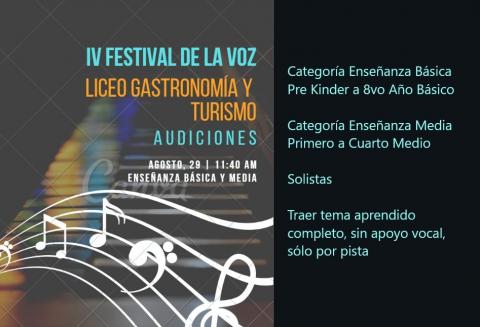 Atención Estudiantes Liceo Gastronomía y Turismo: Se invita a las audiciones para participar en el IV Festival de la voz del Liceo Gastronomía y Turismo.